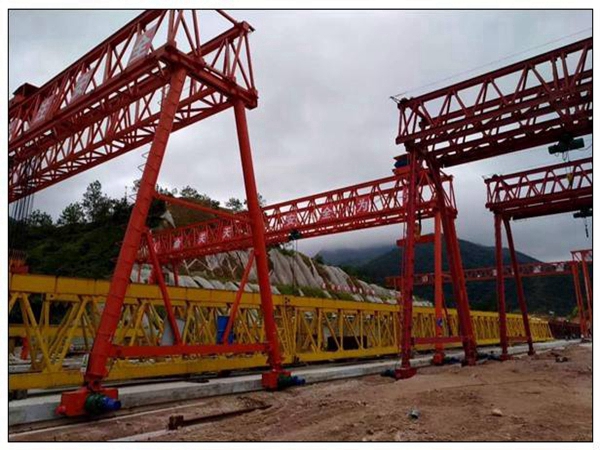 3、整體吊裝龍門吊。將主梁用吊車吊運至軌跡上,依據(jù)現(xiàn)場高度,挑選適當(dāng)長的鋼絲繩,吊梁與梁應(yīng)盡量縮短吊繩長度,增大起吊高度。起吊期間留意人員的配合。